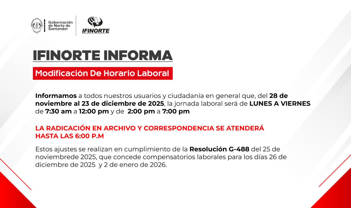 Informamos a todos nuestros usuarios y ciudadanía en general que, del 28 de noviembre al 23 de diciembre de 2025, la jornada laboral será de lunes a viernes de 7:30 a.m. a 12:00 m. y de 2:00 p.m. a 7:00 p.m.