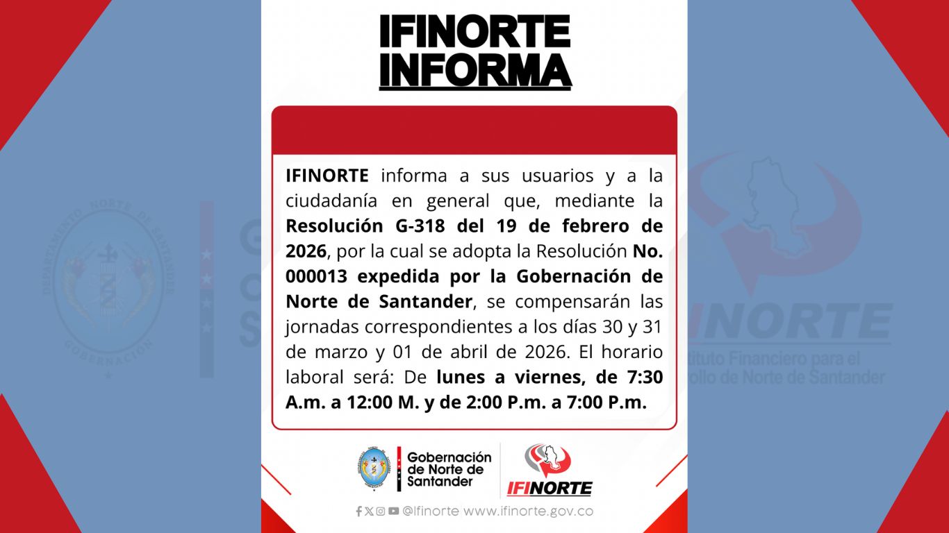 El Instituto Financiero para el Desarrollo de Norte de Santander – IFINORTE informa a sus usuarios y a la ciudadanía en general que, mediante la Resolución G-318 del 19 de febrero de 2026, la Entidad adopta la Resolución No. 000013 del 05 de febrero de 2026, expedida por la Gobernación de Norte de Santander.