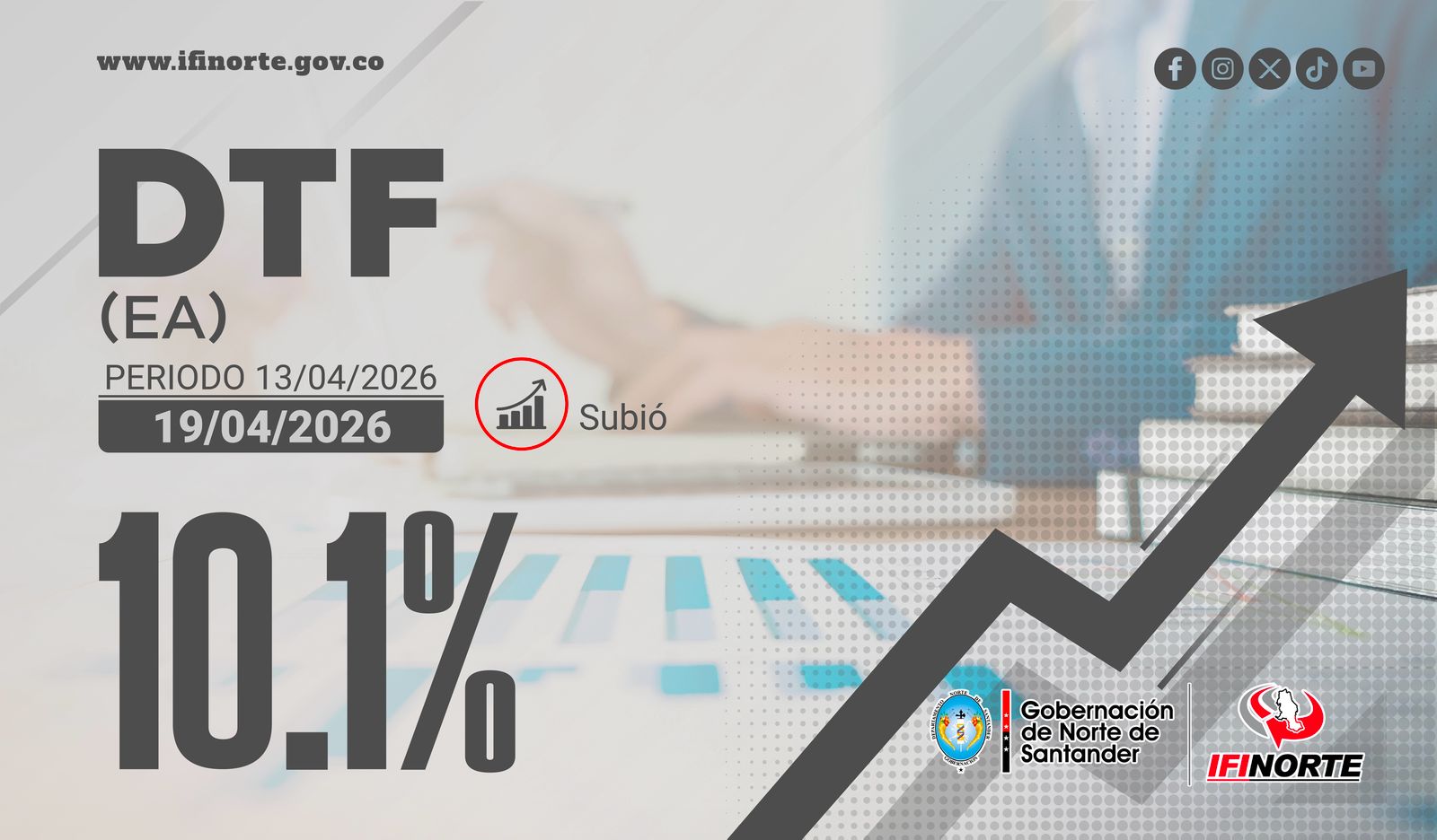 DTF VIGENTE DEL 13 AL 19 DE ABRIL ES DEL 10,1% (SUBIÓ) 14/04/2026webmasterComments (0) La tasa DTF vigente es del 10,1%, (subió), aplicable del 13 al 19 de abril de 2026. Referencia clave para el sistema financiero del país.