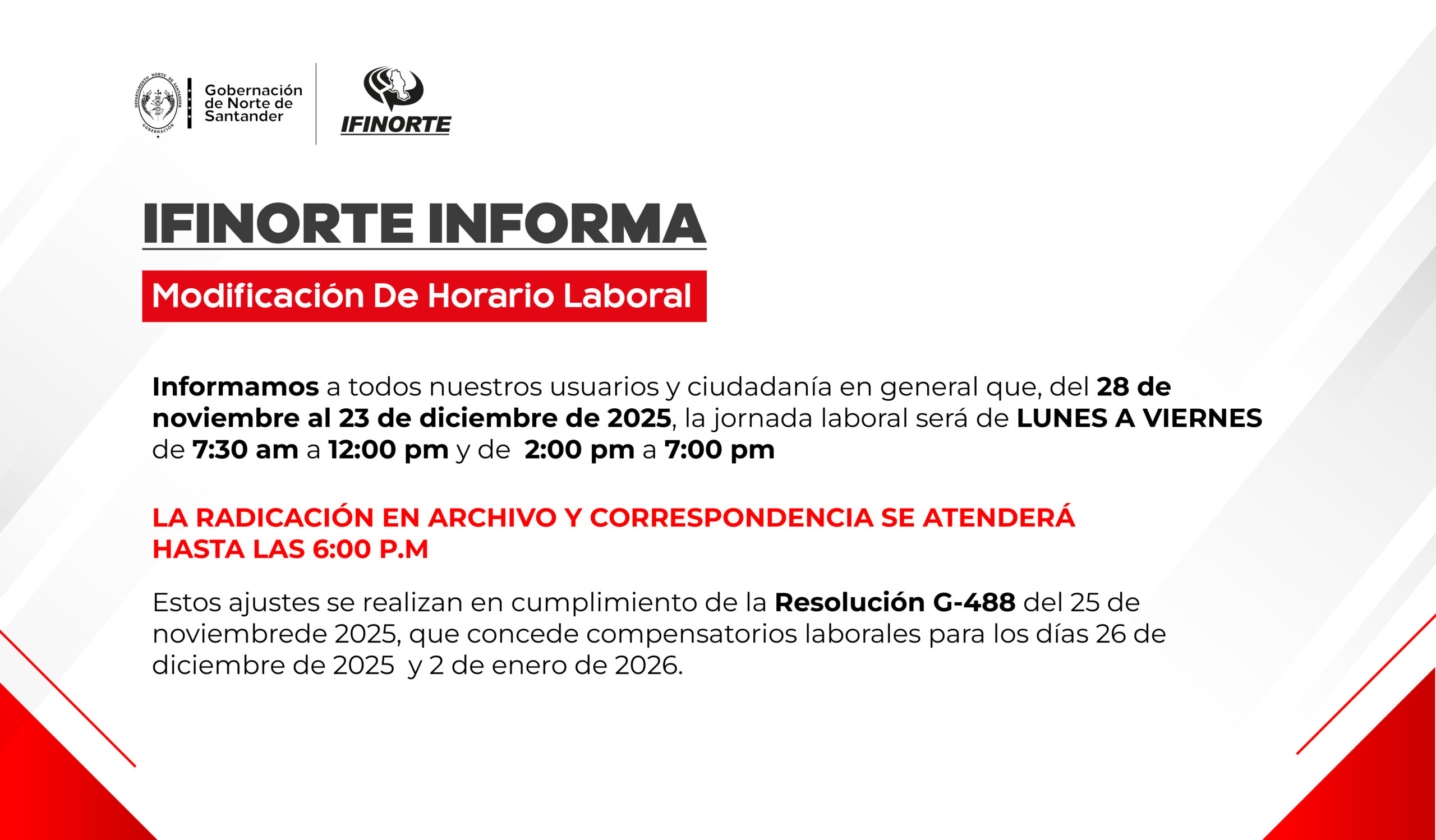 Informamos a todos nuestros usuarios y ciudadanía en general que, del 28 de noviembre al 23 de diciembre de 2025, la jornada laboral será de lunes a viernes de 7:30 a.m. a 12:00 m. y de 2:00 p.m. a 7:00 p.m.